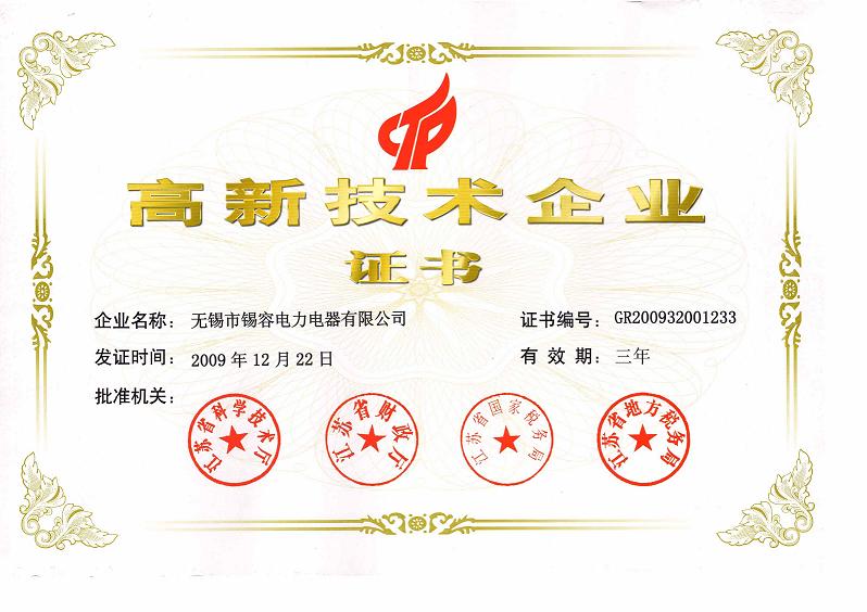 2009年12.22日,無(wú)錫市錫容電力電器有限公司獲取高新技術(shù)企業(yè)證書(shū),批準(zhǔn)機(jī)關(guān):江蘇省科學(xué)技術(shù)廳、江蘇省財(cái)政廳、江蘇省國(guó)家稅務(wù)局,江蘇省國(guó)家稅務(wù)局