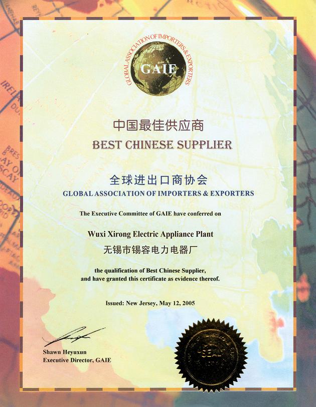 was awarded the best supplier in China on July 12, 2005 by the Global Import and Export Association.